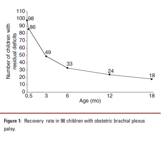 הגרף לקוח מתוך מאמר שוודי בו נבדק מספר הילודים בהם נותרה פגיעה כל שהיא בעצבוב השריר מתוך 98 ילודים עם פגיעה מולדת במקלעת הברכיאלית. אנו רואים שככל שחולף הזמן, מספר קטן יותר של ילדים נותר עם פגיעה. מן המחקר ניתן ללמוד ששיפור יכול עוד להתרחש עד גיל שנה וחצי, אך ניתן גם לראות שעד גיל 9 חודשים רוב רובם של התינוקות שהתאוששות מן הפגיעה כבר הראו החלמה מלאה[1].